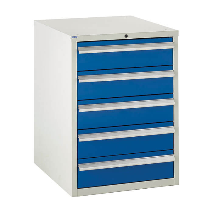 This 600 Euroslide cabinet has 5x 150mm high tool drawers. They feature full width, fullextension precision ball race slides for smooth and easy opening. Each drawer cabinet has central locking with an anti-tilt feature that stops the user opening more than 1 drawer at a time. 2 keys are supplied with each cabinet.