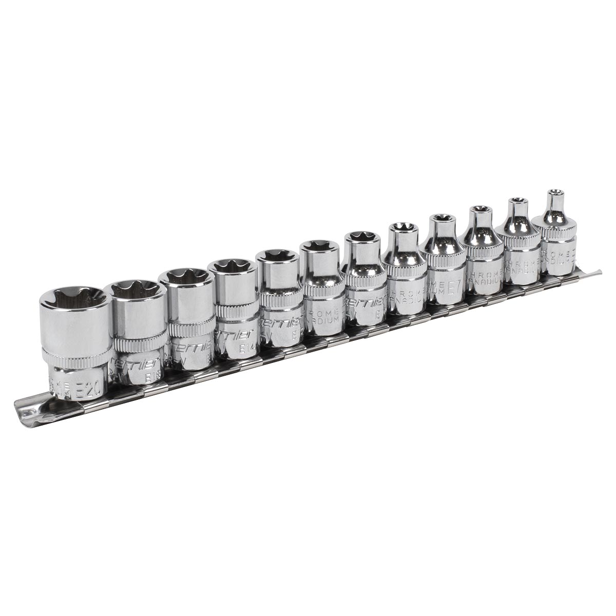 - 12PC SET OF SOCKETS – 3/8”Sq Drive TRX-Star* sockets suitable for a range of applications. Contents: E4, E5, E6, E7, E8, E10, E11, E12, E14, E16, E18, E20.