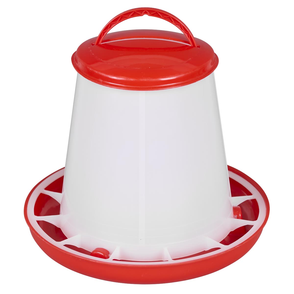 Twist lock base fitting secures the base of the feeder. Features removable lid to protect the contents and built-in hanging handle. Anti-scrape ring prevents feed being spilled and built-in fins evenly distribute the feed. Manufactured from high quality plastic with a robust design. Suitable for use with all types of poultry.