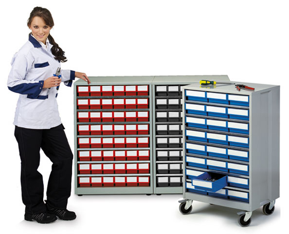 - Each cabinet includes a Grey epoxy-enamelled steel frame, colour bins, labels and protective shields